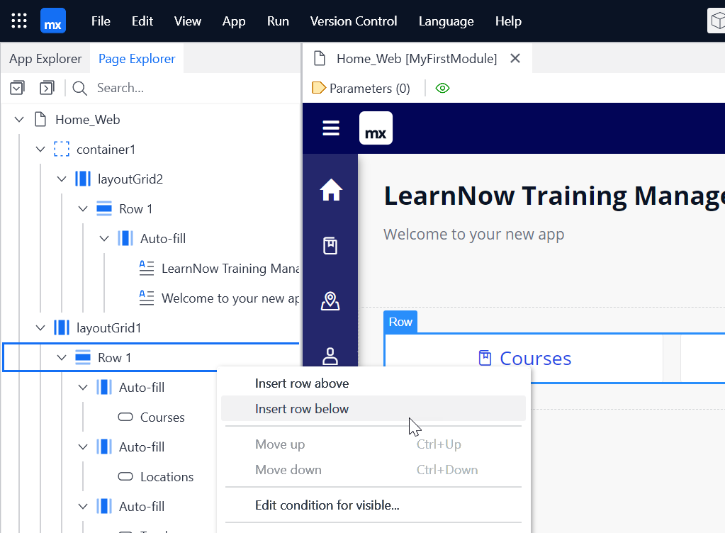 1. 다섯 번째 홈페이지 버튼을 만듭니다. 홈_웹 페이지로 이동하여 레이아웃 그리드에 행을 추가합니다. 3,3,3,3 옵션을 선택하여 첫 번째 행의 열 레이아웃을 복제합니다.