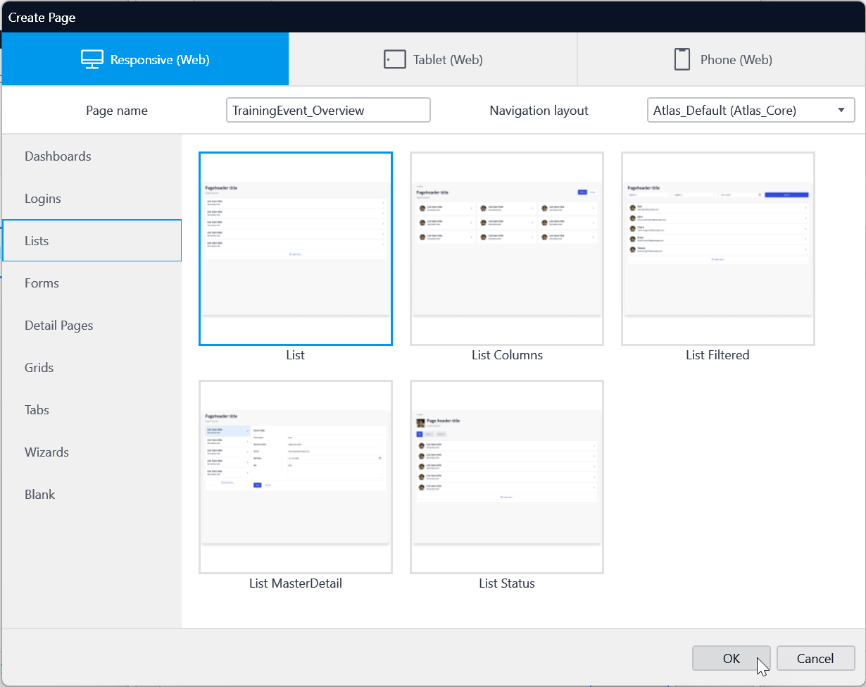 4. 페이지 이름을 TrainingEvent_Overview로 설정합니다. 다른 개요 페이지와 마찬가지로 Navigation Layout과 List 템플릿으로 Atlas_Default를 선택합니다. 확인을 클릭합니다. 버튼 편집 창에서 확인을 다시 클릭합니다.