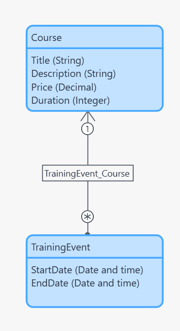 1. TrainingEvent 엔터티 위에 마우스를 갖다 댑니다. 엔티티의 테두리에 나타나는 흰색 원을 클릭하고 새 연결을 코스 엔티티로 끌어옵니다. 연결은 기본적으로 일대다 연결로 생성됩니다. 연결 유형을 변경하려면 연결을 두 번 클릭하고 다른 유형을 선택하면 됩니다.