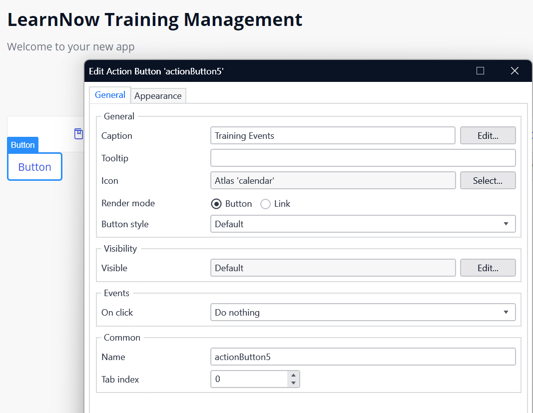2. Butrton을 ToolBox 에서 Drage 하여 추가 합니다 그리고 버튼의 캡션을 Training Events 로 변경하고 달력 아이콘을 찾습니다. 또한 모양 설정을 크기: 크게 및 전체 너비로 설정합니다.