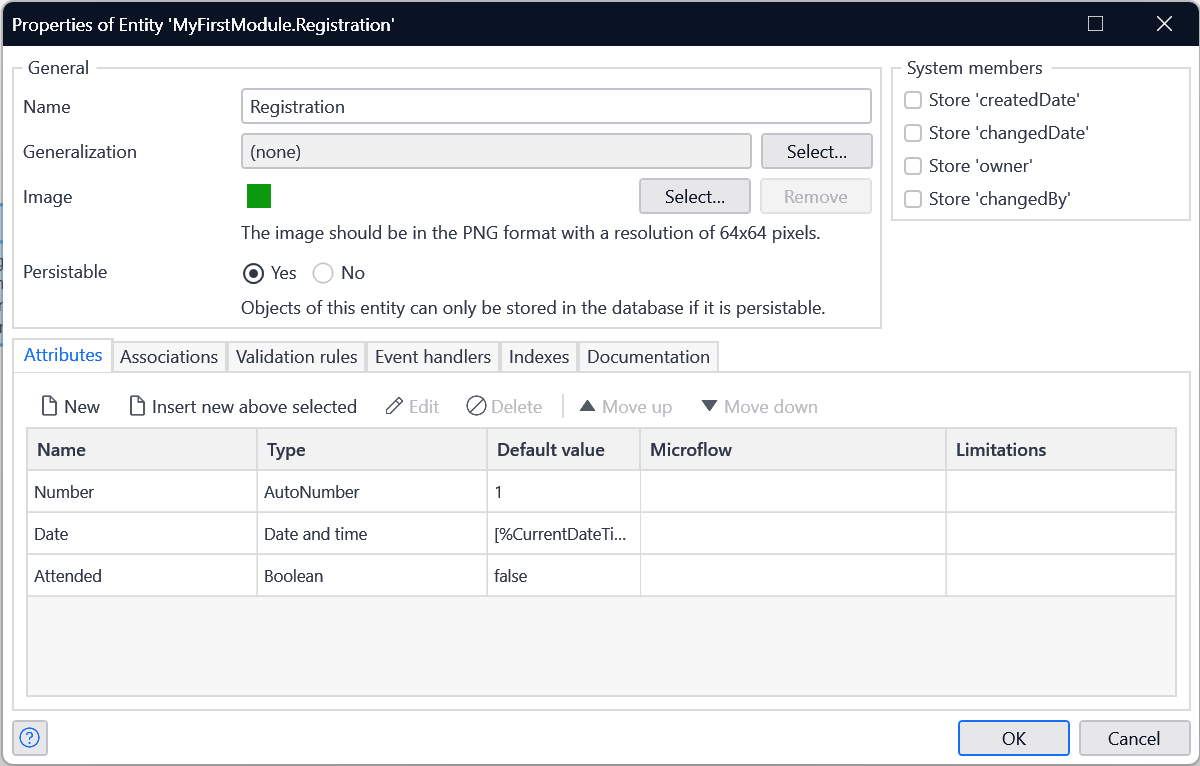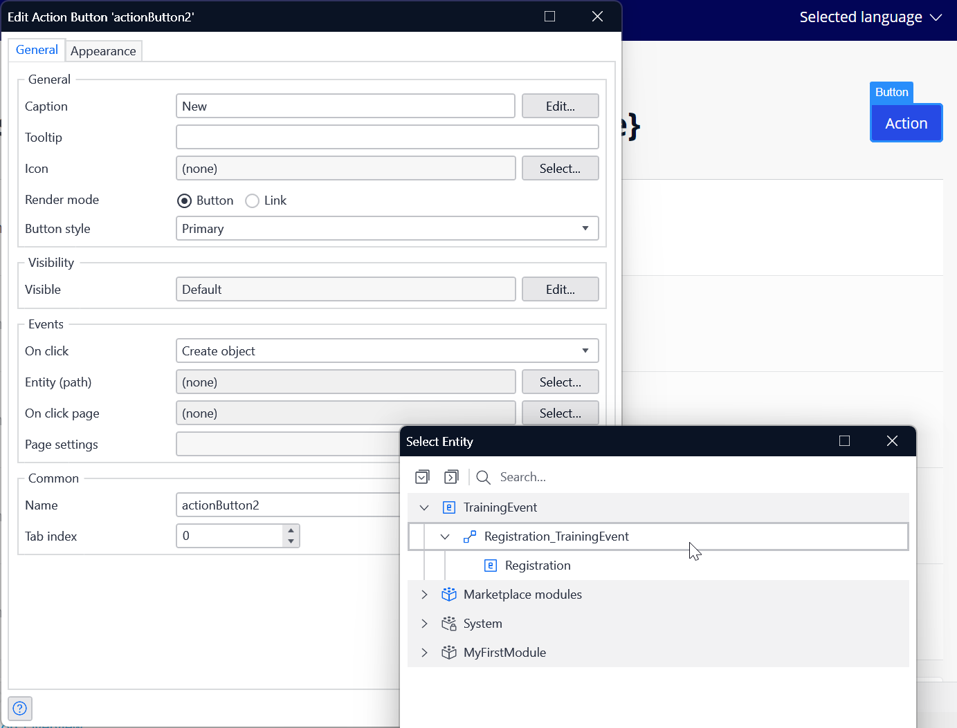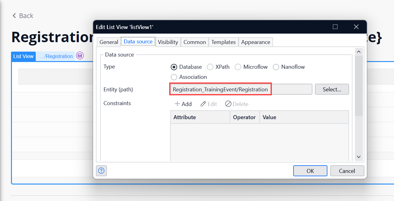 List view 의 속성을 열고 데이터 소스 탭에서 엔티티 선택 창을 엽니다. 선택할 수 있는 두 가지 Registration 옵션이 표시됩니다: