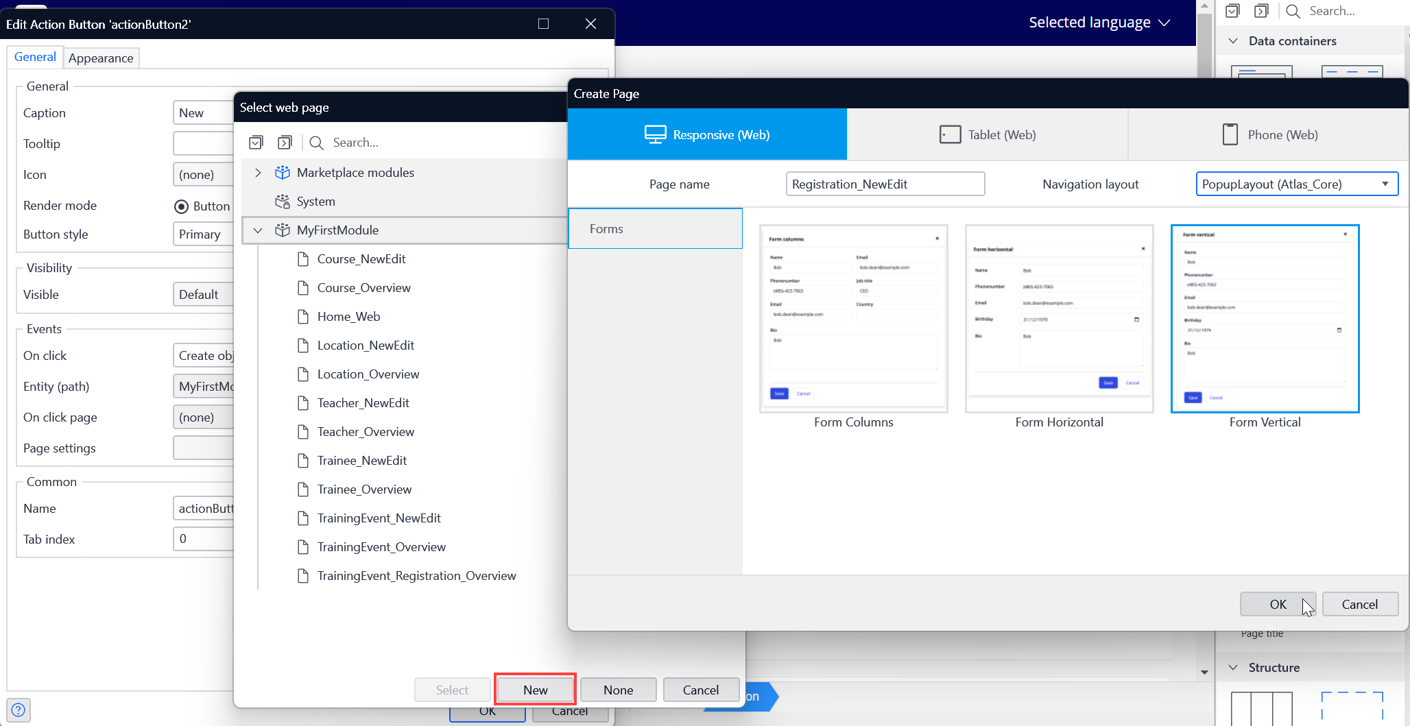 5. List view 의 속성을 열고 On-click 을 Show a page로 변경합니다. 새 페이지인 Registration _NewEdit 을 선택합니다.