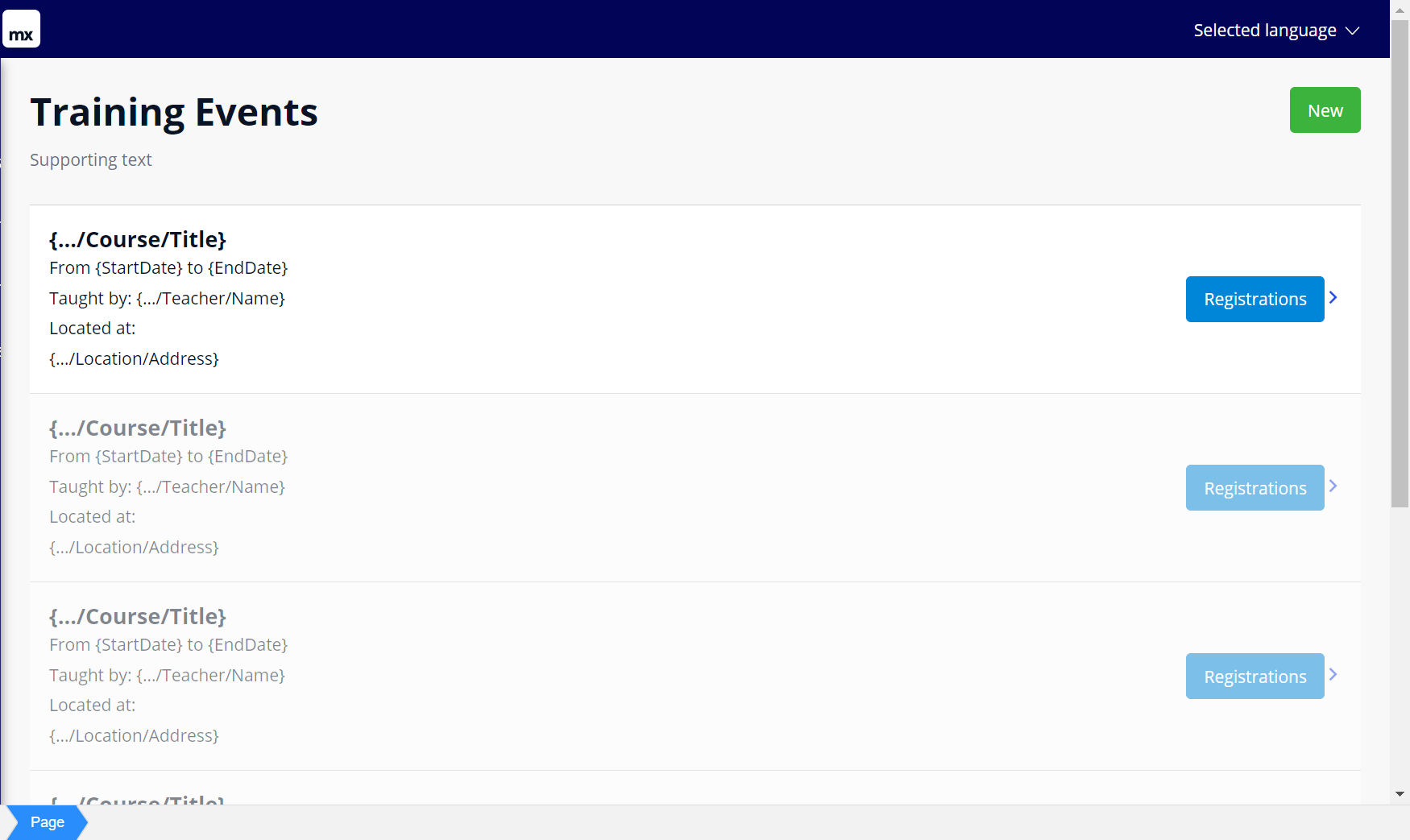 3. 함께 제공되는 큰 텍스트 위젯을 사용하여 TrainingEvent 의 정보를 사용하여 설명적인 제목을 구성합니다(예: {Course/Title}, {StartDate})