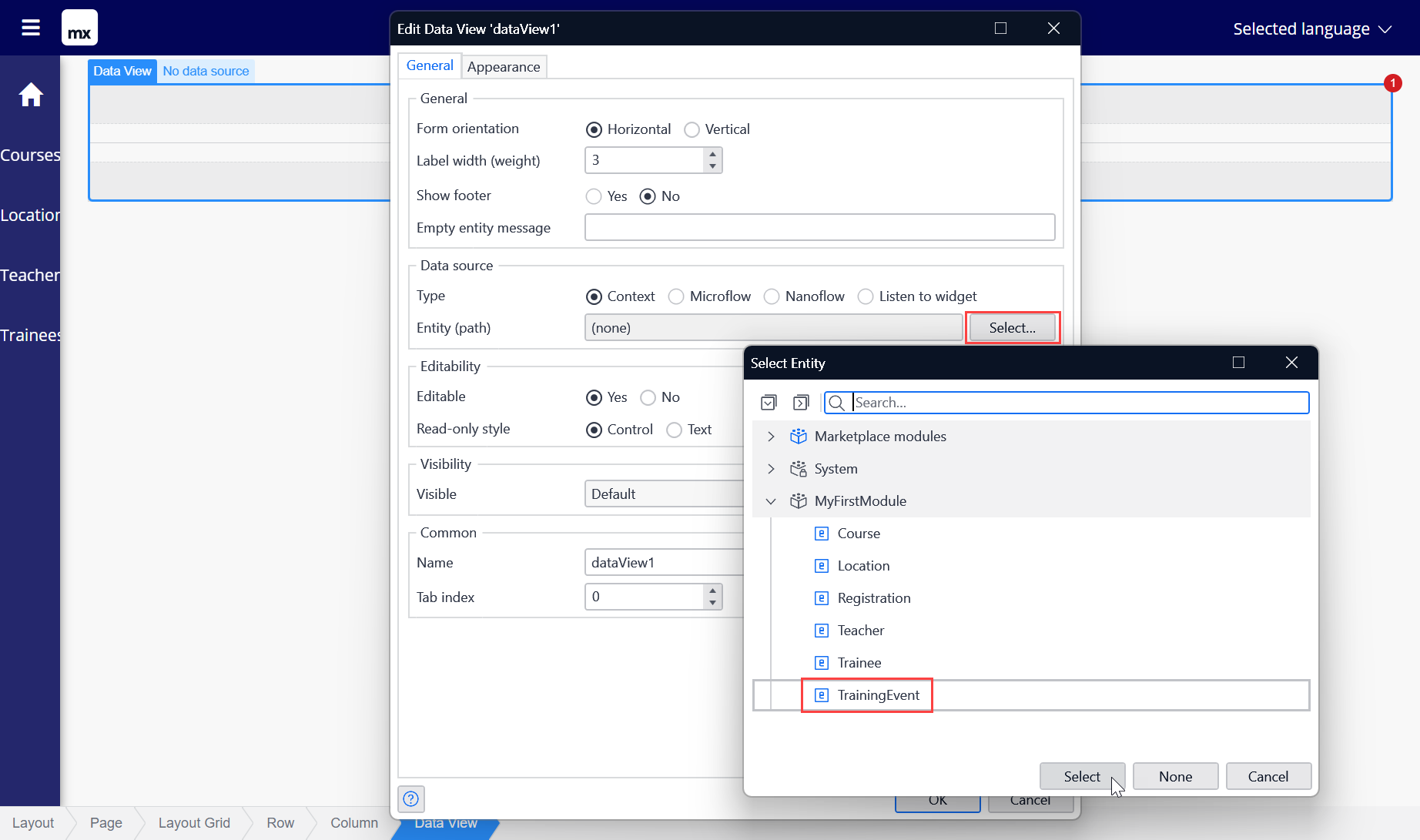 Data view 위젯을 TrainingEvent 엔티티에 연결합니다. 페이지의 내용을 자동으로 채우지 마세요.