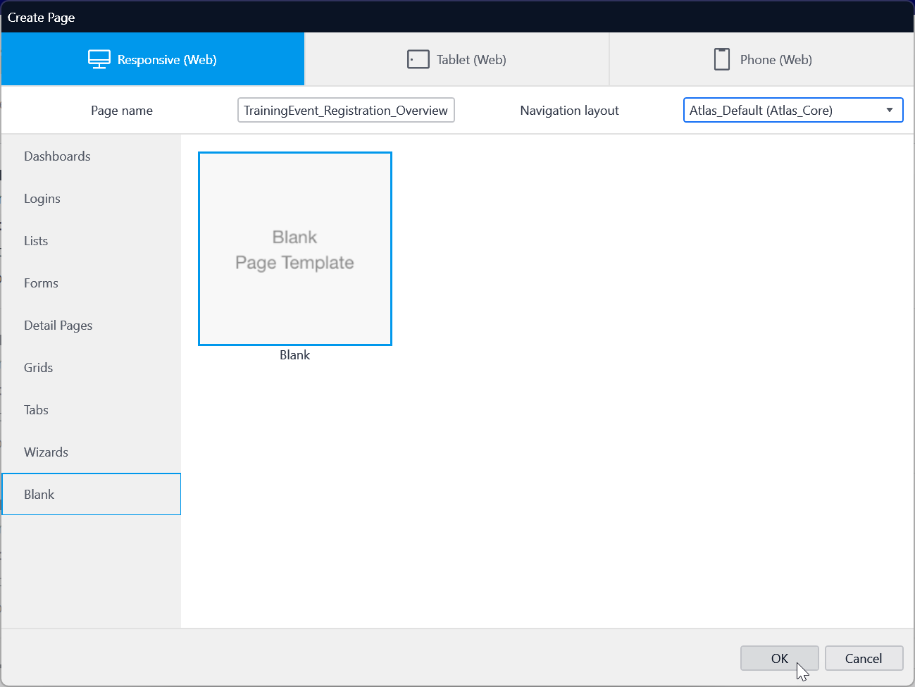 이 페이지를 처음부터 새로 만들 예정이므로 빈 템플릿을 선택합니다.Atlas_Default 탐색 레이아웃을 선택 확인을 클릭합니다.