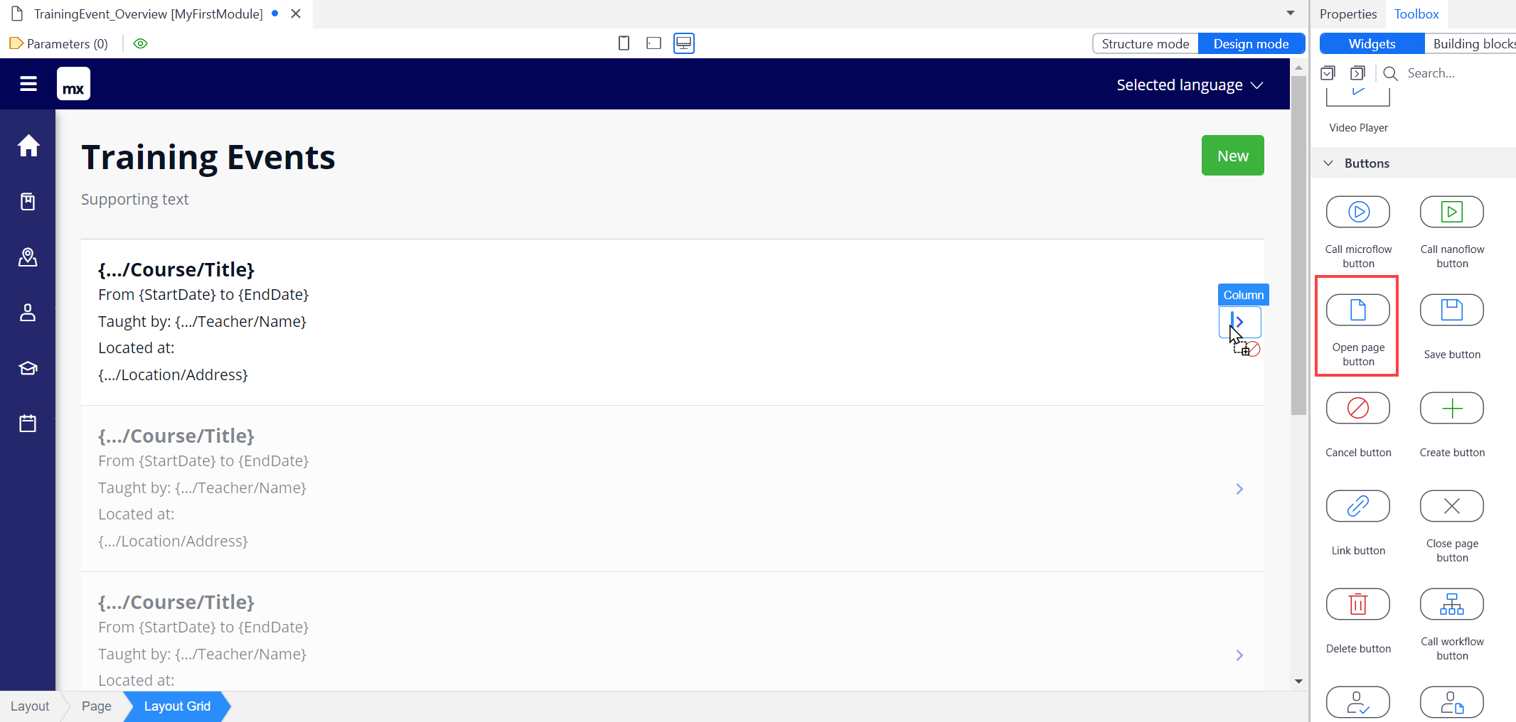 1. TrainingEvent_Overview page로 이동 후 도구 상자에서 Open Page 버튼을 찾습니다. “>” 버튼 위에 놓아 ‘>’ 버튼 바로 왼쪽에 배치합니다.