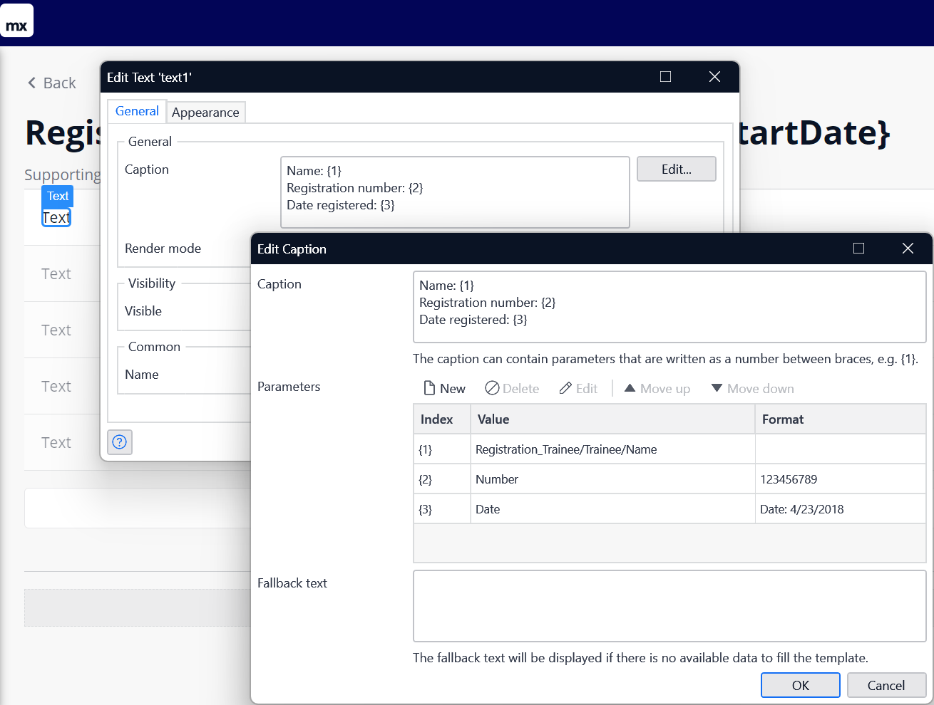 6. List view 콘텐츠에 텍스트 위젯을 추가하고 Trainee의 Name, Registration Number및 Date Registered를 표시하도록 캡션과 매개 변수를 구성합니다.