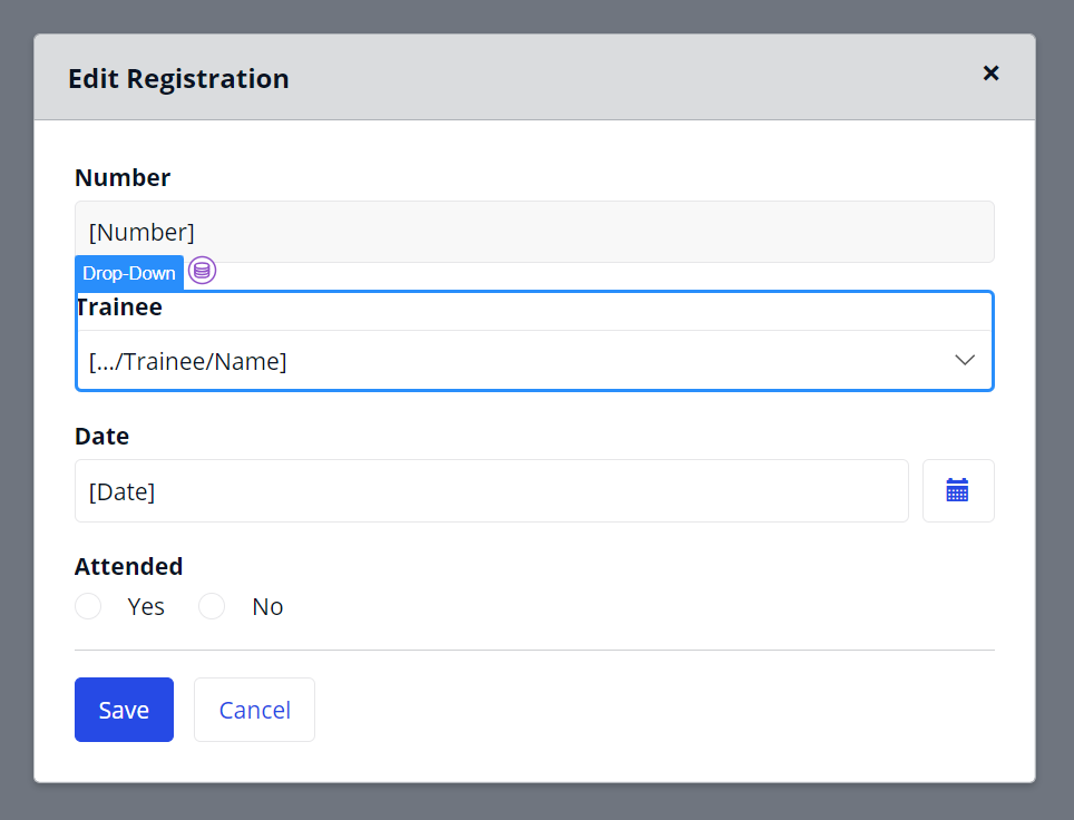 6. 방금 만든 Registration _NewEdit 페이지를 엽니다. Trainee가 가장 먼저 편집 가능한 필드가 되어야 합니다. Trainee 선택 위젯을 날짜 선택 위젯 위로 이동합니다.