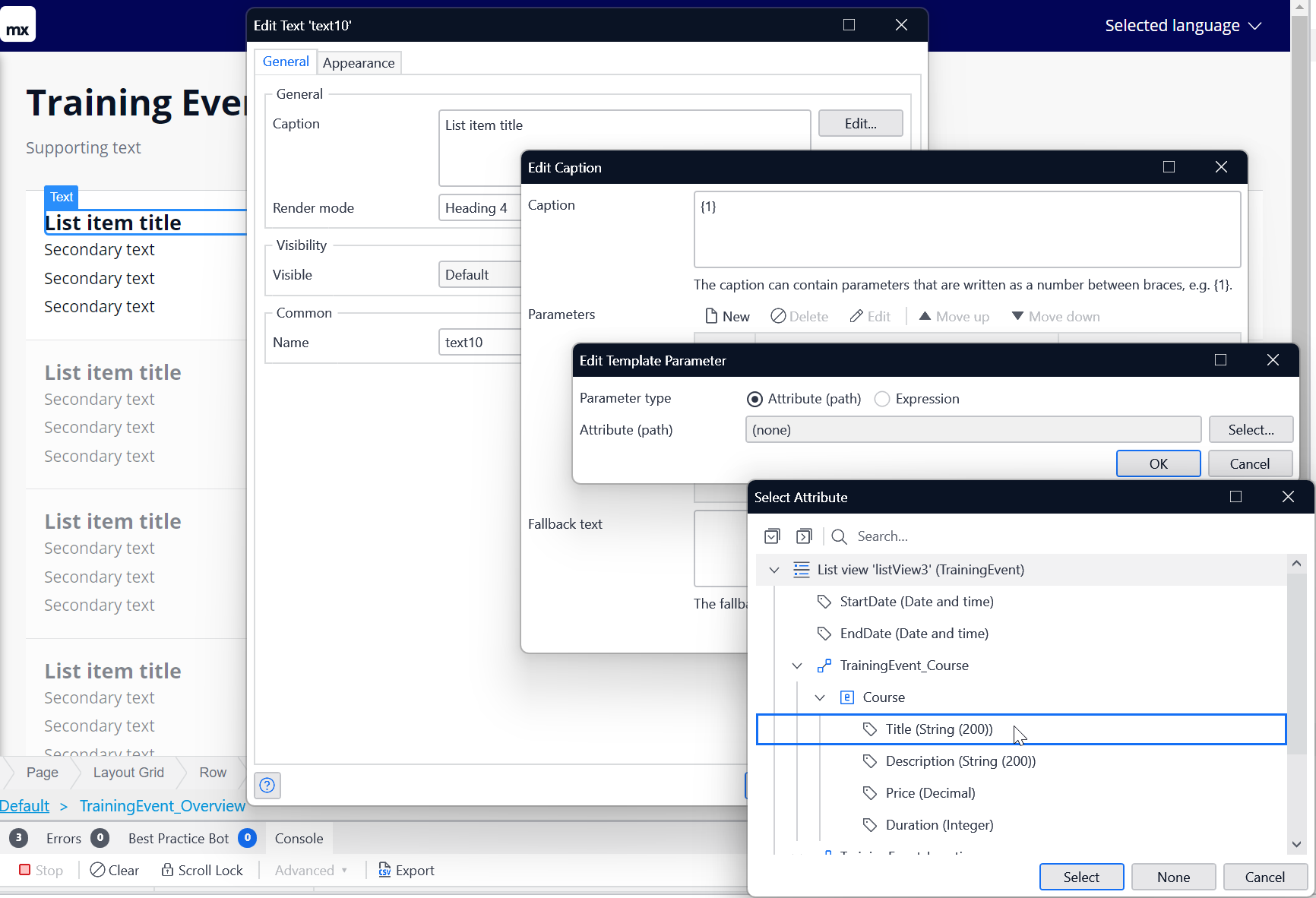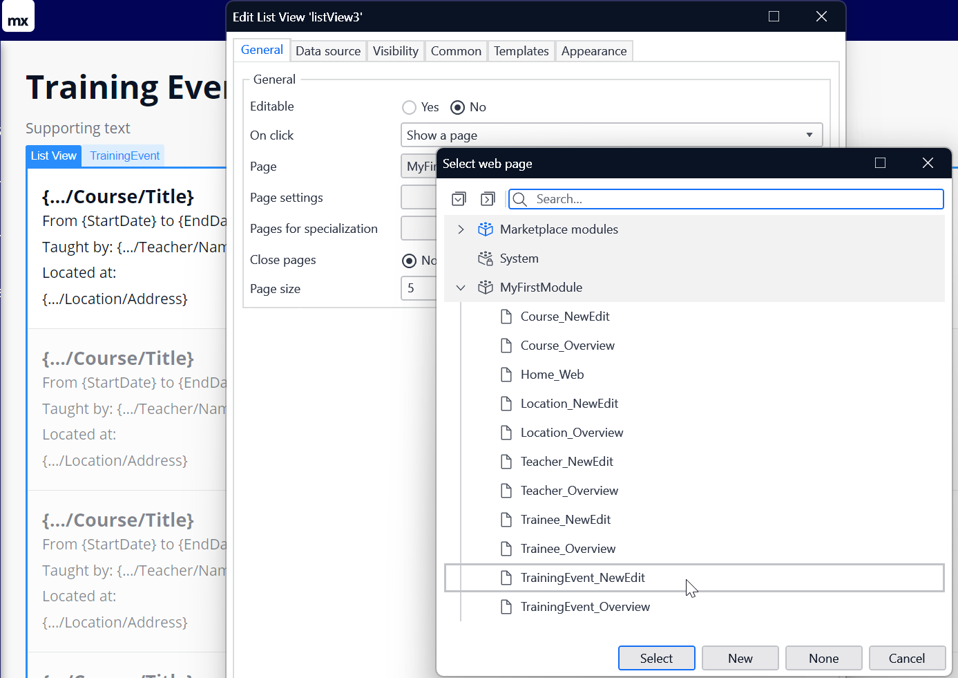 4. 마지막으로, 기존 객체를 편집하기 위해 TrainingEvent_Overview 페이지에서 List View의 클릭 시 동작을 구성하여 TrainingEvent_NewEdit 페이지로 이동합니다.