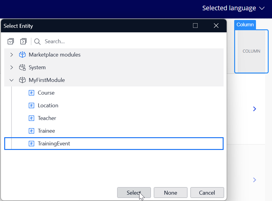 2. Tool Box 에서 Create Buttom을 새 열로 끌어다 놓습니다. 팝업 창에서 TrainingEvent 엔티티를 선택합니다.
