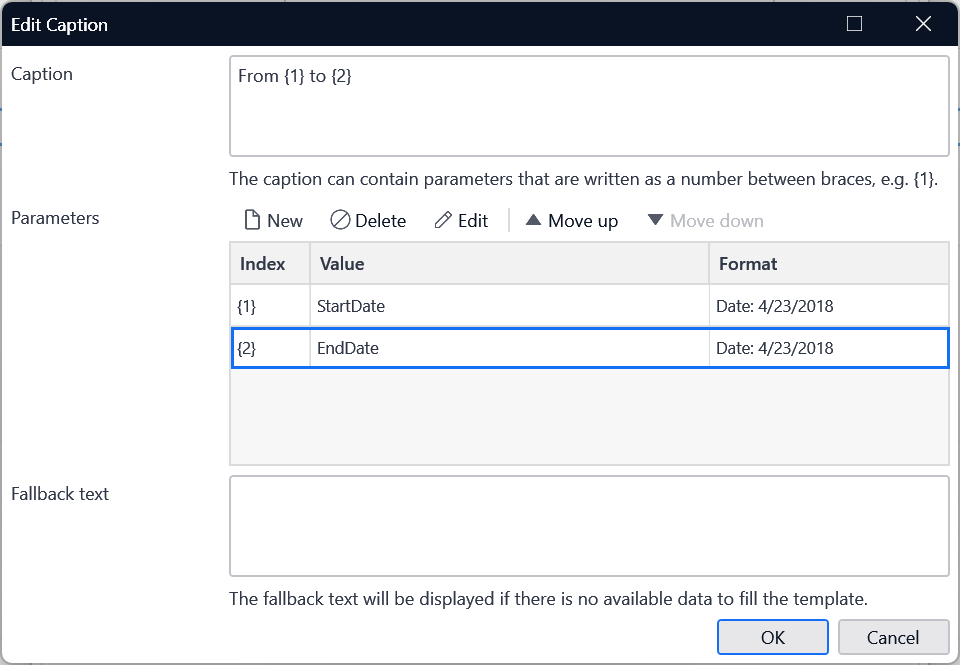 c. 캡션 수정 창의 캡션 필드에 {1}을 입력합니다. 새로 만들기를 클릭하여 {1}에 표시될 파라미터를 설정합니다. 템플릿 매개변수 수정 팝업에서 선택을 클릭하고 코스 드롭다운을 펼친 다음 제목을 선택합니다.